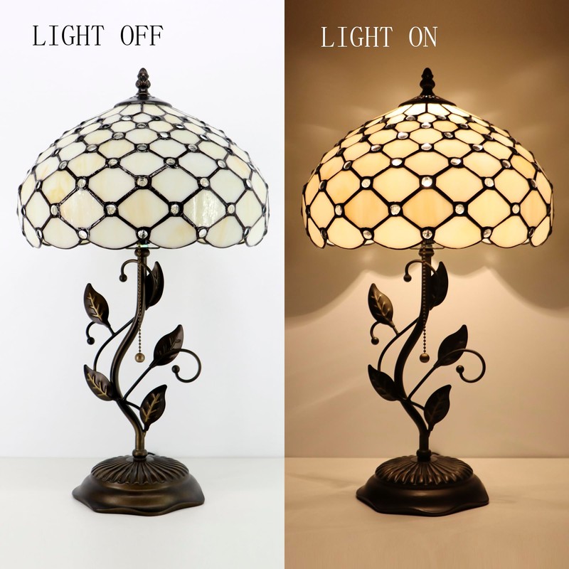 HWDFEI Tiffany Table Lamp, Stained Glass Style Desk Lamp, 12X12X19 Inch,Bedside Reading Light, Metal Leaf Base (Cream Bead Style)