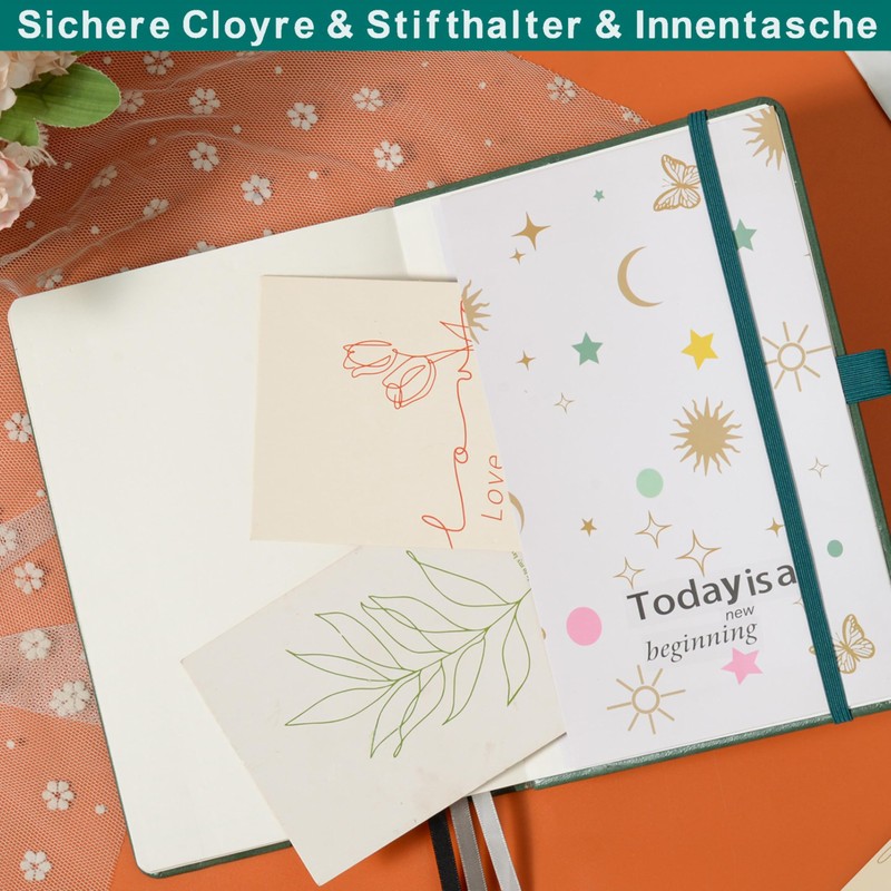 - 180° Flach-liegendes Journal für Frauen: Das Journal lässt sich um 180° öffnen, was das Notieren mit beiden Händen erleichtert und die Lesbarkeit verbessert. Der elastische Verschluss sichert die Seiten, während das Lesezeichenband hilft, Ihre Notizen mühelos zu verfolgen.