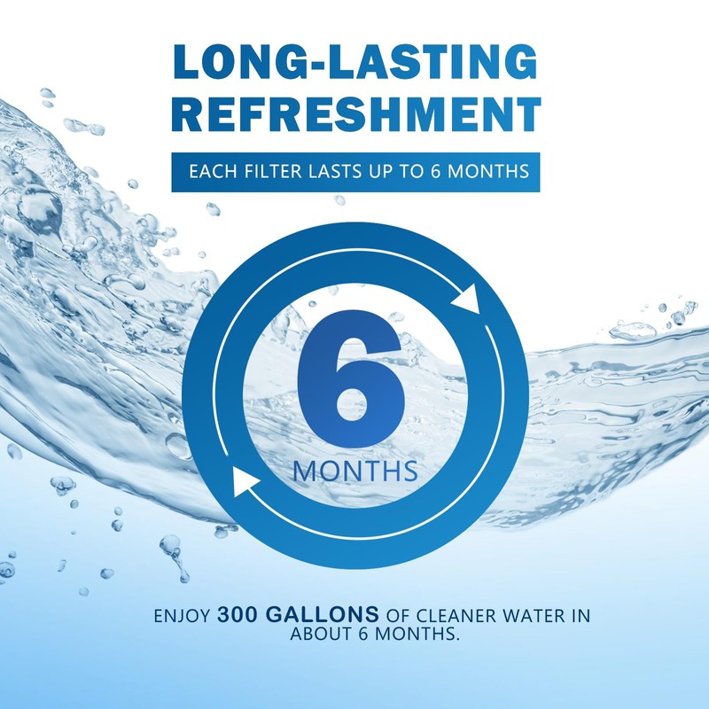 - Filter Life : 300 Gallons or 6 Months. Depends on water quality, whichever comes first.