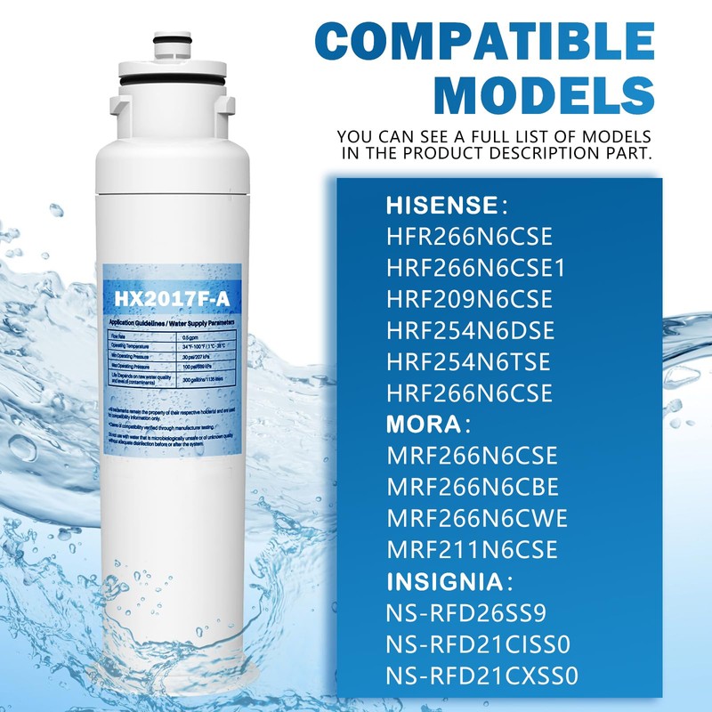 - HX2017FR-A Water Filter Replacement Model: Compatible with Hisense HFR266N6CSE, HRF266N6CSE1, HRF209N6CSE, HRF254N6DSE, HRF254N6TSE, HRF266N6CSE; Mora MRF266N6CSE MRF266N6CBE MRF266N6CWE MRF211N6CSE; Insignia NS-RFD26SS9, NS-RFD21CISS0, NS-RFD21CXSS0.