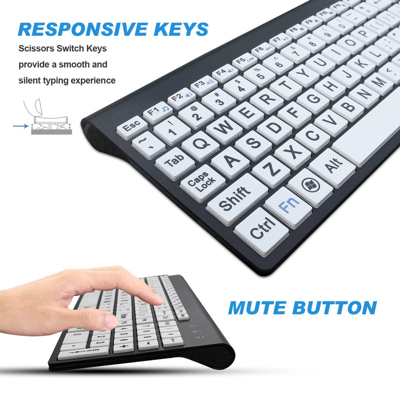 - 【Large Print】 High contrast, large print keyboard offers increased visibility with easy to see white keycaps and crisp large print black letters. These high-contrast keys can really help those who have trouble seeing keyboards. Perfect for elderly, the visually impaired, schools, special needs departments and libraries, as well as companies.