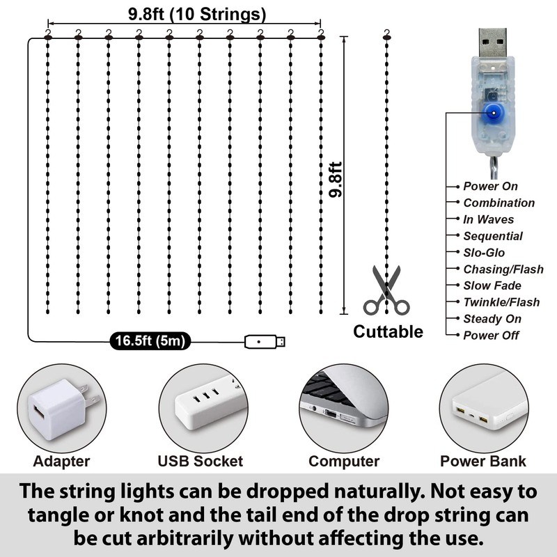 - 【Window Curtain Fairy Lights】: 9.8 x 9.8ft curtain light with 300LEDs and extra 16.5ft long power cord. 9.8ft main strand and 10 drop strings included hooks. It’s USB powered, making it suitable for more places to get powered even in camping or barbecue .Or Powered by power bank, laptop, cellphone adapter, etc. It will not get overheated after prolonged use, totally NO risk to cause any electric shock or fire hazard, it’s friendly to kids adults and pets,very sturdy and supper safe to touch.