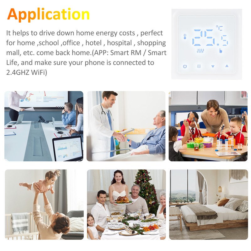 APP Control(With WiFi version only): the WiFi version smart thermostat can be remotely controlled by your mobile devices (cell phone, tablet and computer) before you come back home. (APP: Smart RM/Smart Life, and make sure your phone is connected to 2.4GHz WiFi)