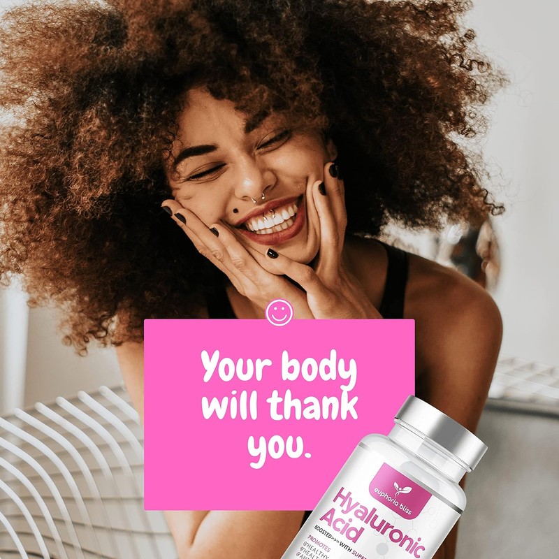 ✔ REJUVENATE YOUR SKIN: Hyaluronic acid is a naturally occurring compound in the body, crucial for skin hydration and joint lubrication. As we age, its levels decrease, but our supplement replenishes it to promote a youthful, radiant complexion. Enhanced with superfruits like Blueberry, Sea Kelp, Acai Berry, and Pomegranate, it supports skin rejuvenation from within.