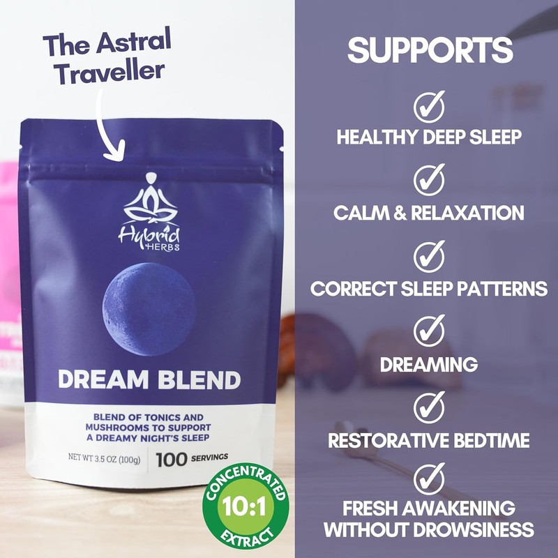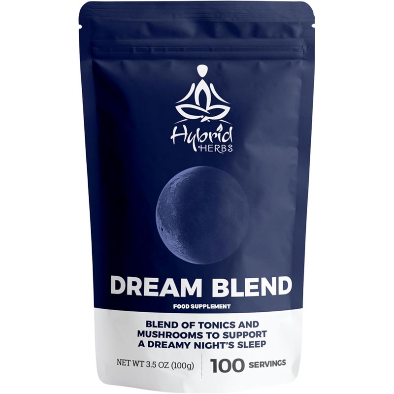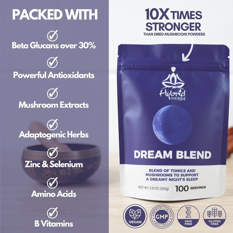 HYBRID HERBS Dream Blend 10X Strength – High Potency Sleep Supplement with Organic Reishi Mushroom, Reishi Spores, Chaga & He Shou Wu – 10:1 Extract for Deep Restful Sleep – 100 Servings (100g)