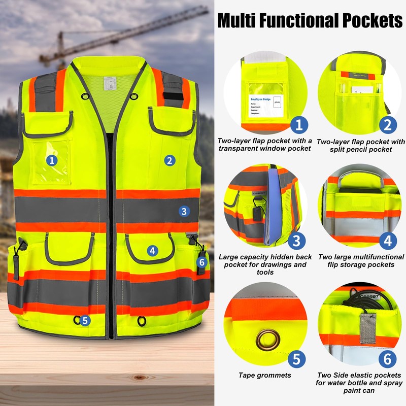 The front of the safety vest is made of more durable knitted material, which can provide better support for the pockets. The back of the safety vest is made of breathable mesh material, so you won't feel stuffy when wearing it, and it has better breathability and ventilation. The design with padded collar also provides better support for the safety vest and make your neck feel more comfortable.The safety vest adopts a high visibility neon color. At the same time, 2-inch reflective strips are used on the shoulders, waist, and back, and the edges of the safety vest are wrapped with reflective strips to maximize visibility during the day and night, ensuring the safety of you and your family. Our safety vest full compliance with ANSI/ISEA 107 Class 2 standards. The safety vest has a total of 16 multifunctional pockets.One two-layer flap pocket with a transparent window pocket on the right chest. One two-layer flap pocket with split pencil pocket and tool pocket on the left chest. Two elastic pockets and two large flap pockets with flagging tape grommets at lower waist. One large capacity hidden back pocket for storing drawings and tools. Two large pockets with zippers , two pockets with Velcro and one ocket for storing mobile phones on the inner layer of the vest.The safety vest perfect for construction workers, baggage handling, security, traffic control, warehouse workers, survey, landscaping, airport, paving, railroad, sanitation, volunteers. Also suitable for personal sports, pet walking, night running, jogging, cycling, hiking, walking, biking, motorcycle and dog walking.