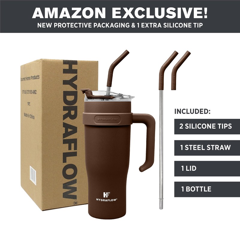 HYDRAFLOW Capri - 40oz Tumbler with Straw and Handle - Triple Wall Vacuum Insulated Tumbler - Insulated Smoothie Cup - Stainless Steel Tumbler - Reusable Tumbler with Lid - Cocoa