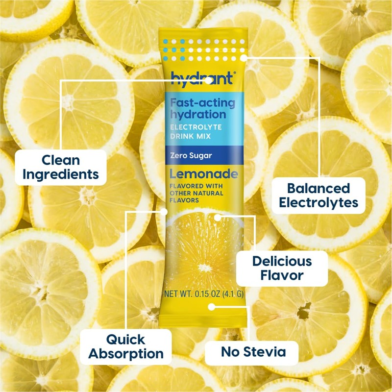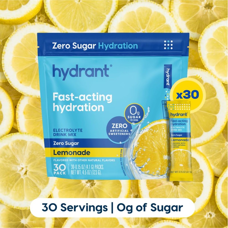 HYDRANT Hydrate No Added Sugar, Individual Hydration Electrolyte Powder Stick Packets with Zero Sugar and Electrolytes for Rapid Hydration (Lemonade, 30 Count)