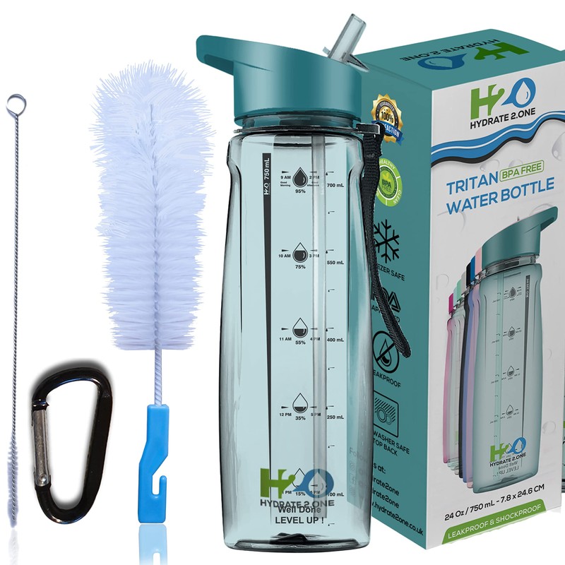 - MORE REASONS TO LOVE US - With 2 cleaning brushes for bottle and straw, our water tracker bottle is super easy to clean after each use; a removable carrying strap plus a carabiner to hang on your backpack. Based in the UK, Hydrate 2. A water bottle respects both people's needs and the environment. Our goal is to encourage people to change themselves and nature, starting with seemingly insignificant but crucial habits, such as their water bottle choices