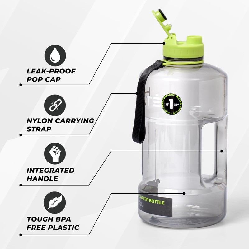 Hydrate Bottles - 2.2L Large Water Bottle with Sleeve - Leak Proof BPA Free Impact Resistant Plastic - Unique Design with Carrying Strap - Ideal for Gym, Workout, Camping, Office - Bitter Lemon Design