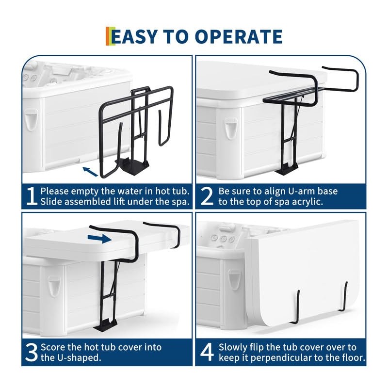 - 【Mounted Underneath on One Side Spa Cover Lifter& Easy to Use】Pool Cover Lifter is designed for single-person operation, making hot tub maintenance hassle-free and you can mange the tub cover effortlessly Cover. Lift, remove, and replace your hot tub cover with ease using the Cover Lifter. It is more effortless than typical lifts, helping reduce pre-bath preparation time.