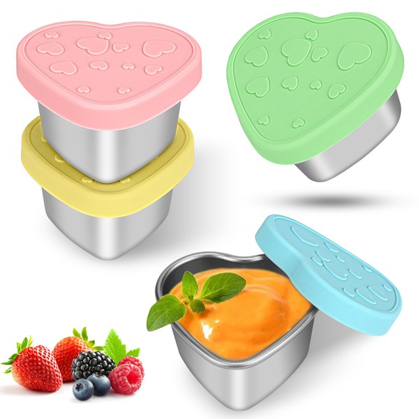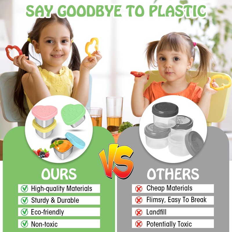 - Easy to open lids for colourful salad dressing containers: the silicone lids of the mini sauce container are soft and make the stainless steel spice cup very easy to open. The different colour makes it easy for you to distinguish the sauces. It just fits perfectly for picnics, summer camp and travel