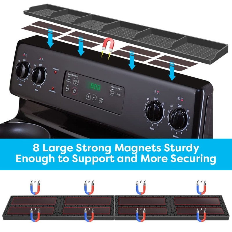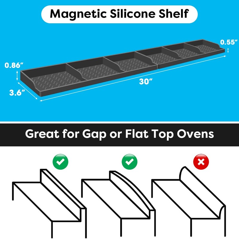 - Stay in PlaceSilicone magnetic shelf for stove hold things on the back of stove securely and in place. your stuff won't fall down to the stove any more when you open and shut the stove door, bump. also helps block things from falling behind the stove.