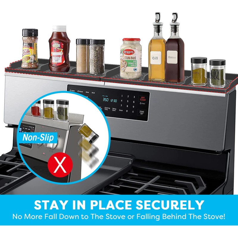 - Easy to CleanShelf for stove spice rack is flexible, easy lays down and remove for cleaning.?heavy silicone able to hold it's shape up and keep your stove clean, it won't slip off the stove top. Great for getting your spices in easy access when cooking. A must have for kitchen organization!