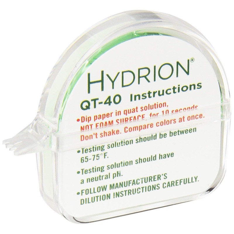 Hydrion QT-40 Quaternary Test Paper provides a simple, reliable, and economical means to measure the concentration of Quaternary Sanitizers, particularly multi-quat broad range quaternary ammonium sanitizer solutions. With color matches at 0-150-200-400-500ppm (parts per million), the test paper measures concentrations between 0-500ppm, detecting exhaustion of solutions that should be replaced as well as helping to avoid using excessive amounts of sanitizing agents. Federal, State and Local health regulations require users of Quaternary Ammonium Sanitizer Solutions to have appropriate test kits available to verify the strength of sanitizer solutions. Sanitizer solutions are essential in the food service industry to ensure that sanitizers are at the proper concentration specified by the individual manufacturer. Each dispenser comes in a box with one 15-foot roll of test paper and matching color chart. Please note there is both a Lot Number and Expiration Date on the color chart.