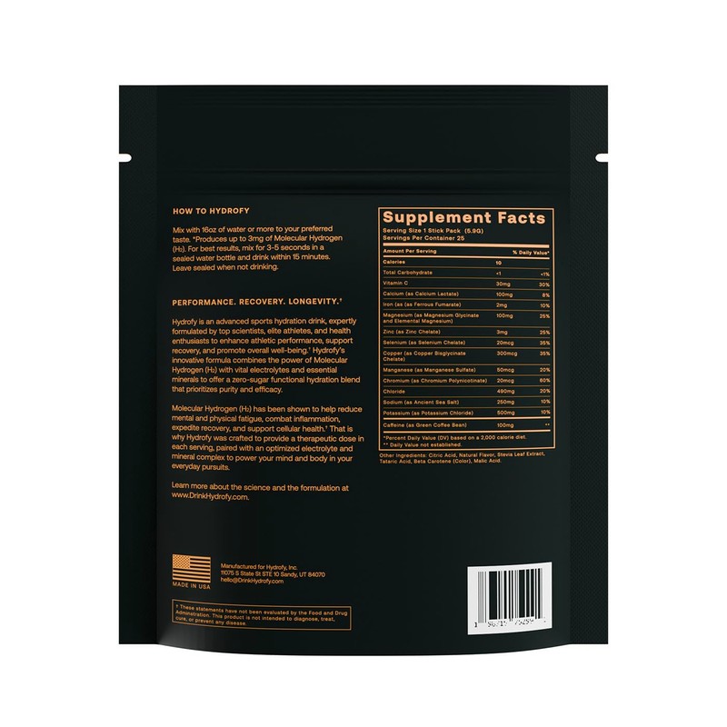 Hydrofy Hydrogen Water + Electrolytes Drink Mix | H2 Hydration Packets with Molecular Hydrogen, Sodium, Potassium, Magnesium, Calcium, and Minerals | No Sugar | Orange + Caffeine 25 ct