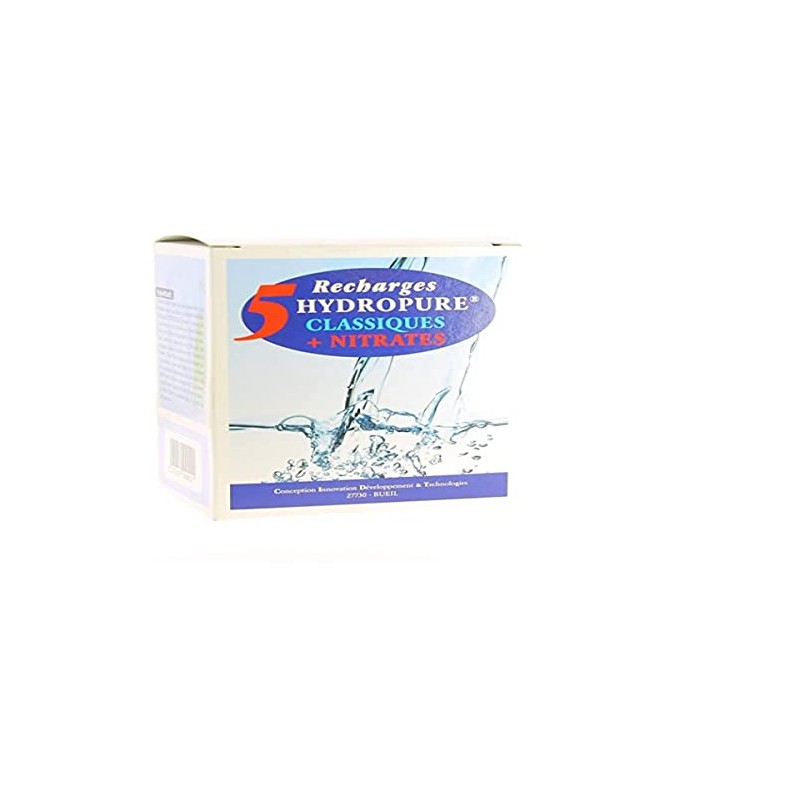 • The classic refill bags + nitrate charge Hydropure the cartridges round or oval hydropure. Box of 5 tied, they reduce the content of limescale, nitrate, chlorine, lead and some pesticides from the water.