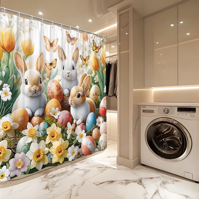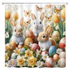 HYEEHY Happy Easter Shower Curtain Rabbit Cute Colorful Eggs Bunny Spring Flower Butterfly Rustic Tulip Floral Garden Holiday Shower Curtains Set Bathroom Polyester Fabric with Hooks (70" W x 70" L)