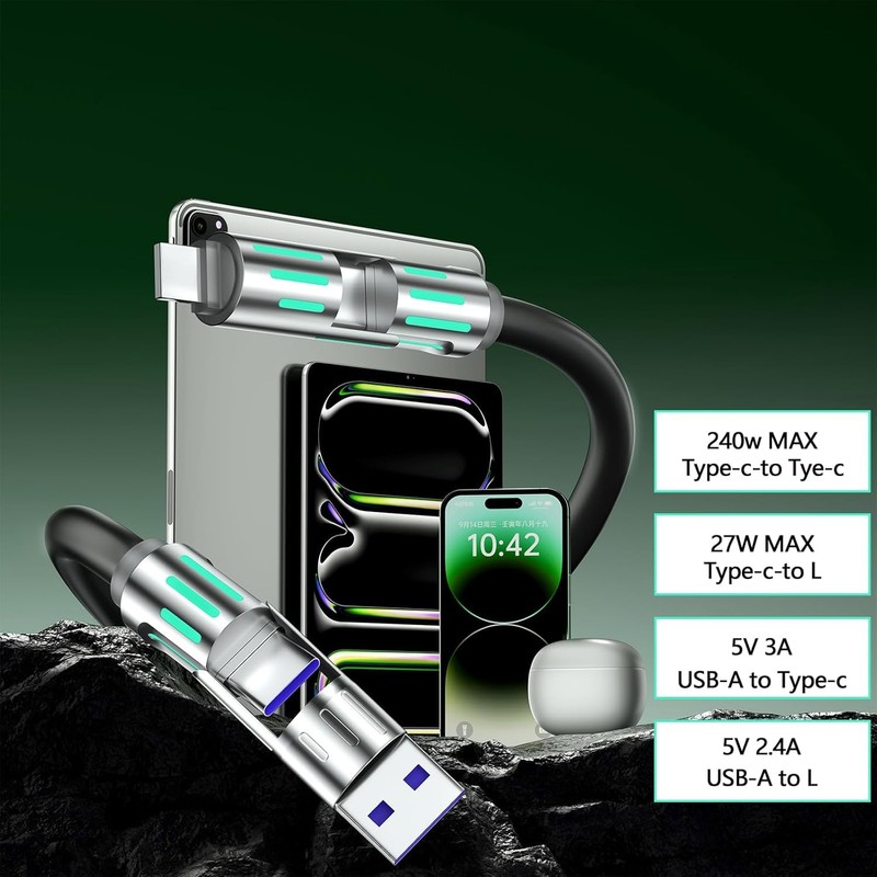 - Multi-function: With four connectors in one cable, you can effortlessly charge a variety of devices, including smartphones, MacBooks, tablets, and more.