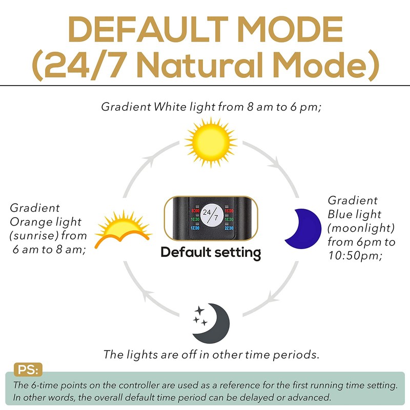 - 🐡DEFAULT MODE(24/7 Natural Mode): Gradient Orange light (sunrise) from 6 am to 8 am; Gradient White light from 8 am to 6 pm; Gradient Blue light (moonlight) from 6 pm to 10:50 pm; The lights are off in other time periods. PS: The 6-time points on the controller are used as a reference for the first running time setting. In other words, the overall default time period can be delayed or advanced.