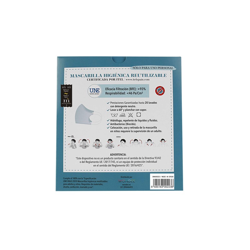- Reusable hygiene mask certified and certified to UNE0065:2020.