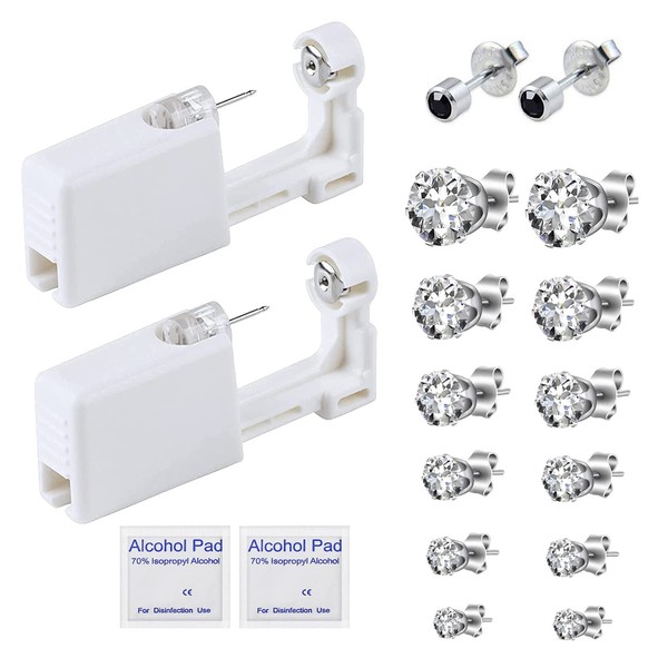 - 【Package Contents】You will receive 2 pack ear piercing guns, 2 piece of 4mm black diamond earrings (Built-in the ear pierce gun), 12 piece silver diamond stud earrings(Individually packaged), 2 cleaning cotton pads