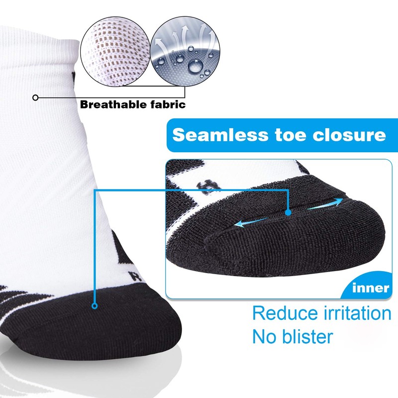 - No Show Breathable Socks: Mesh ventilation construction on instep makes sure brethability. Great for many sports or casual wear, such as running, golf, tennis, gym etc. Performance socks with low ankle design feature and light compression match most of your shoes, while high enough to protect your ankle