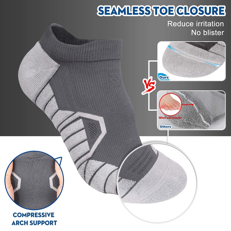 - No Show Compression Socks – These short socks for sports apply gentle pressure to your feet. The compression arch support keeps runners’ arch stable and secure fit, reducing fascia fatigue while running. we added an extra tab to make sure you experience an no blister pair of sucks