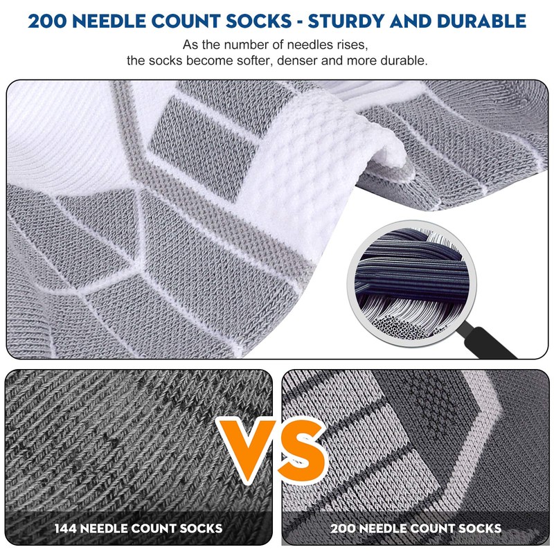 - High Performance Socks - Our 200 needle knit socks achieve the highest levels of quality and durability. While others use 96, 144 needles, we use 200 needles technology to benefit you with denser and lighter socks which makes it the best running socks, gym socks, golf socks and workout socks for men and women athletes