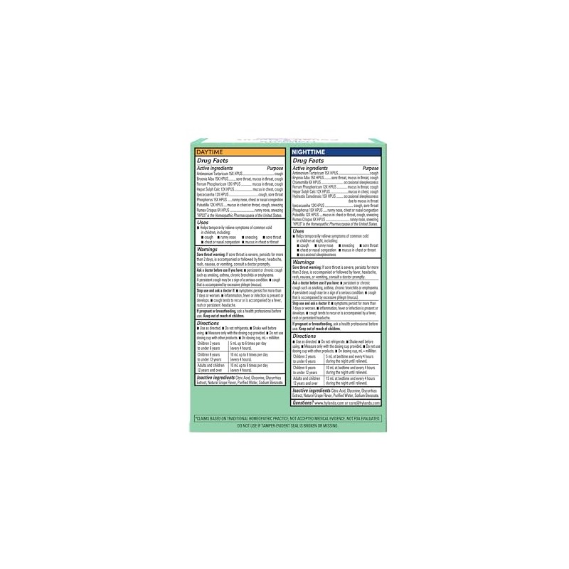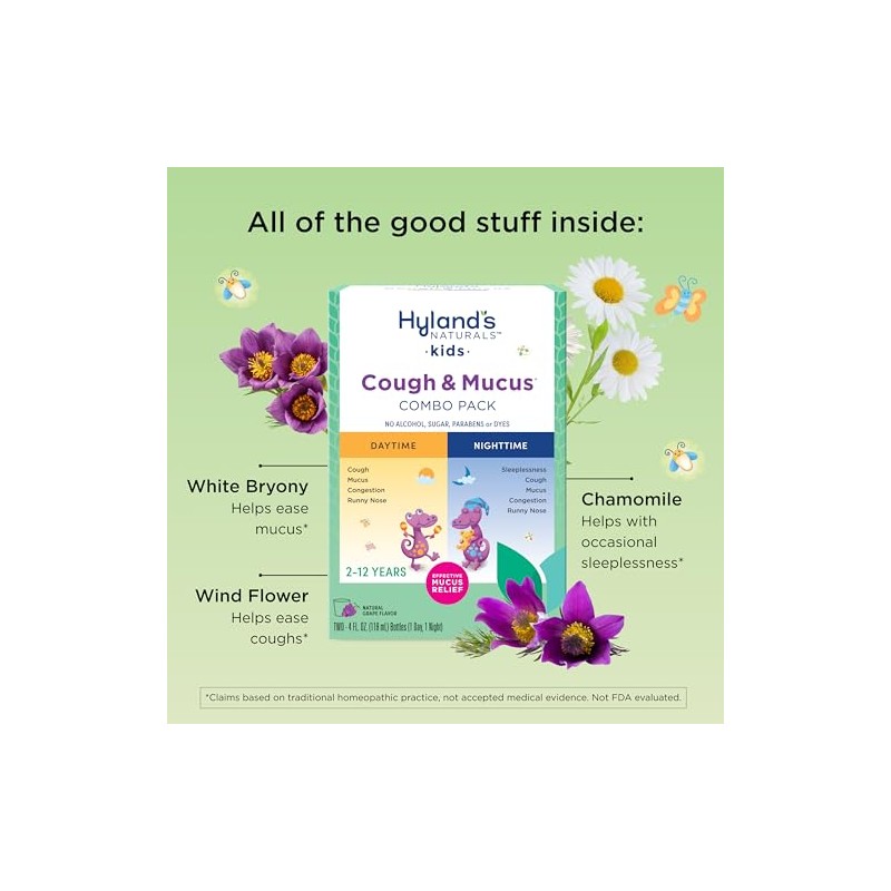 Hyland's Kids Cough and Mucus Daytime & Nighttime Combo Pack provides natural relief of symptoms of cough, mucus, congestion and runny nose and sleeplessness. Hyland's is a leading consumer health brand with more than a century of history making high quality products to help people live healthier and happier lives. Made with natural active ingredients, our products contain no artificial flavors or sugars, dyes or parabens. With a state-of-the-art, FDA regulated and cGMP compliant facility, our top-selling products are sold in more than 15 countries and can be found in every major retailer in the United States.