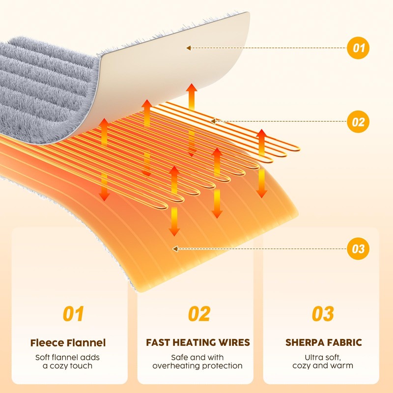 - SUPER SOFT MATERIAL: The heating blanket is made of high-quality flannel and Sherpa, which is very soft and skin friendly, thicker than regular blankets. The electric heating wire is evenly distributed in the middle and fixed with quilting, making the heat distribution more uniform and the existence of the heating wire is hardly felt during use, making it more comfortable