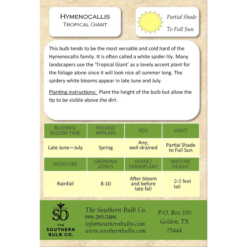 • Even though it is called a ‘Tropical Giant’ this bulb is one of the most cold hardy varieties for a Hymenocallis. It is known for multiplying quickly and surviving freezing temperatures in zones 8-11.