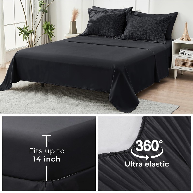 - Deep Pocket Fitted Sheet: Our stretchy deep-pocket fitted sheet easily fits any 12-15 inch mattress and stays in place no matter how you toss and turn; the soft brushed microfiber fabric provides just the right amount of warmth and comfort
