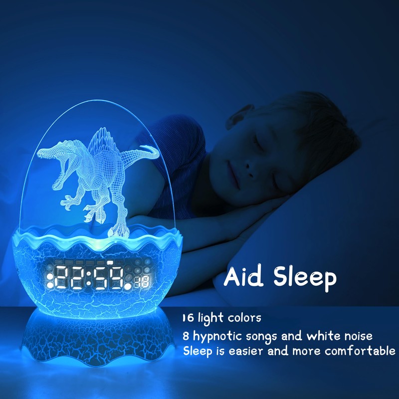 - 【Hypnosis | Companion Sleep | Wake Up Machine】This dinosaur egg could be used as aid sleep machine for kids / boys / girls and adults. It storage 4 soft piano music, 4 natural white noise (Bird song in forest/Sea wave/Rain/Rural fields), and 1 dinosaur roar. Users can personalize the lighting, music and volume in aid sleep mode. Press the button to select the working time 10/20/30 minutes to enter sleep mode. The lullaby volume and lighting gradually decrease and dim, accompanying you or your kids fall asleep. Or select the wake-up button to wake up your baby like the alarm clock.