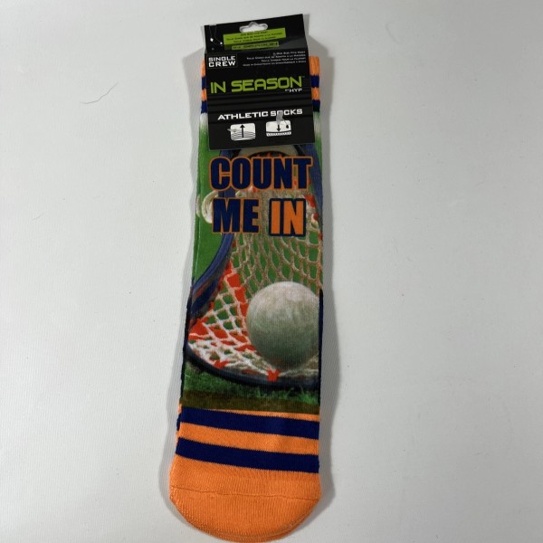 Look stylish with the Count Me In Crew Socks by HYP. These unisex socks feature a Lacrosse print and are perfect for everyday wear. Made of polyester material, the socks are machine washable and have a crew length. The multi-color socks are available in size 10-13 and come in a pack of one pair.