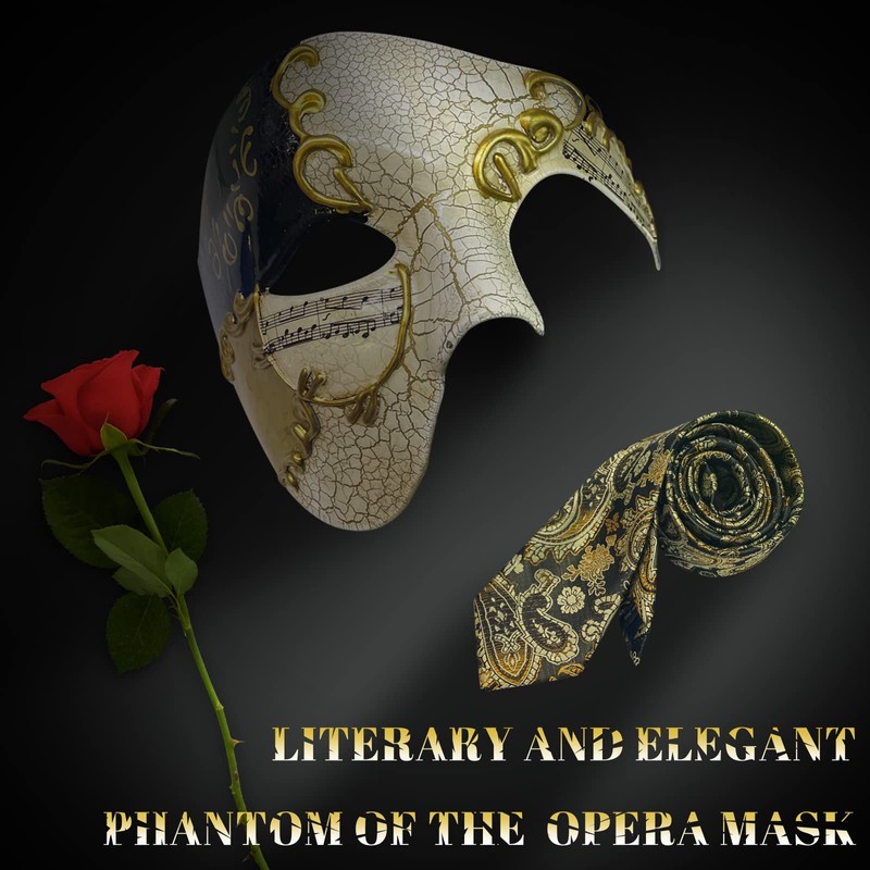 • Phantom of the Opera Mask: The design is inspired by the famous Phantom of the Opera character, this men masquerade mask covers half of your face and bring an element of mystery to your look. A summer ball party can be a dazzling presence at the party by pairing it with a white shirt and exquisite tie!
