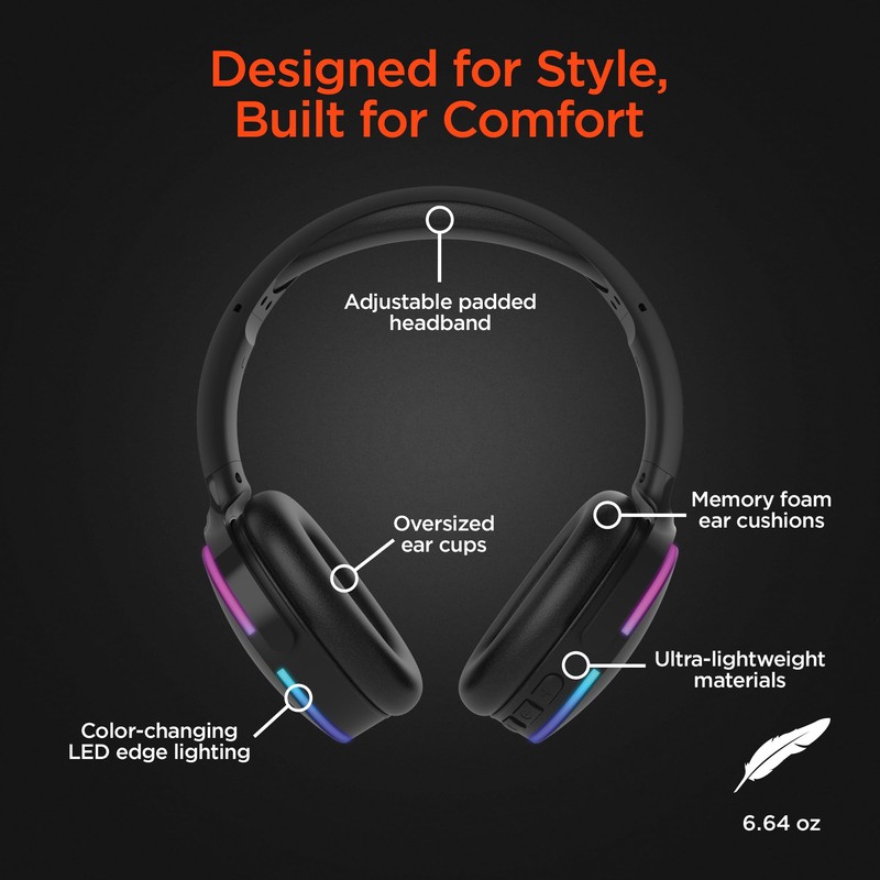 HyperGear Wireless Bluetooth Headphones + Loud HD Stereo Sound Speaker Over-Ear Noise-Isolating Fit Headset with Built-in Mic [LED Light Up Earphones + Speaker] Black