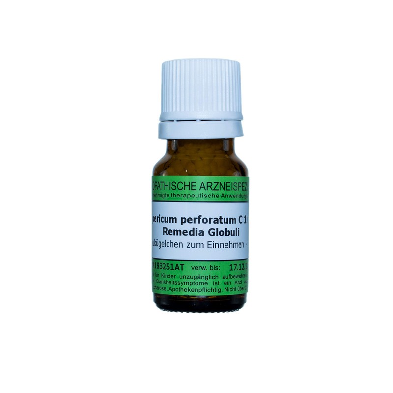 Hypericum perforatum C1000 (pack size: 10g) is a registered homeopathic medicine and therefore without indicating a therapeutic indication. The Globuli are size 3 sucrose stray balls, which are lactose and gluten free. This medicine is produced and controlled according to Homeopathic and European Pharmacopoeia in Austria in GMP quality by REMEDIA Homeopathie GmbH. In accordance with the principles of homeopathy, each treatment is carried out with a medicine individually adapted to the patient and his respective disease. In addition to effects, drugs can also cause side effects. For risks and side effects, please consult your doctor or pharmacist.