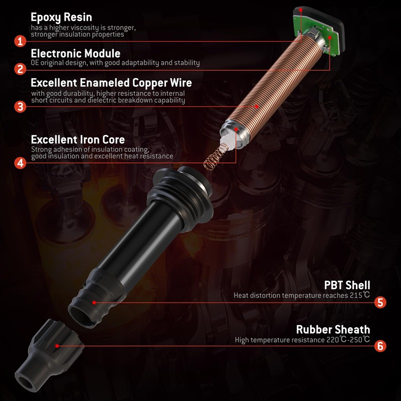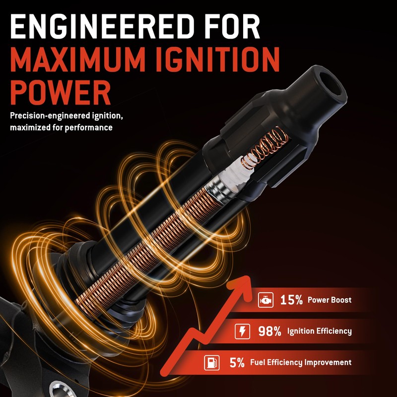 - HIGH PERFORMANCE IGNITION COILS: Our ignition coils are made of copper wire imported from Germany and higher coil turns, capable of generating 35,000+ volts, resulting in more complete combustion, better fuel economy, more power and lower emissions