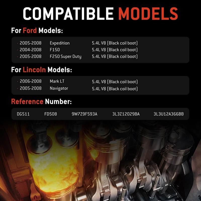 - COMPATIBLE VEHICLE: Ignition coil pack spark plugs fit for Ford Lincoln 5.4L V8 (Black coil boot), 2005-2008 Expedition, 2004-2008 F150, 2005-2008 F250 Super Duty, 2006-2008 Mark LT, 2005-2008 Navigator