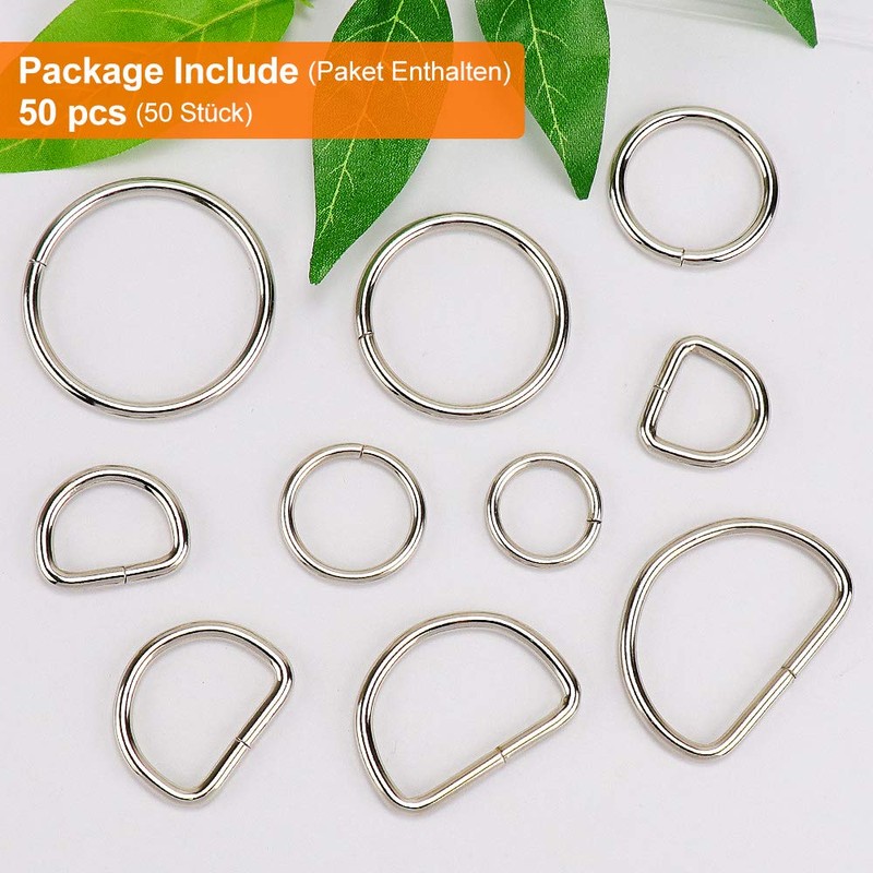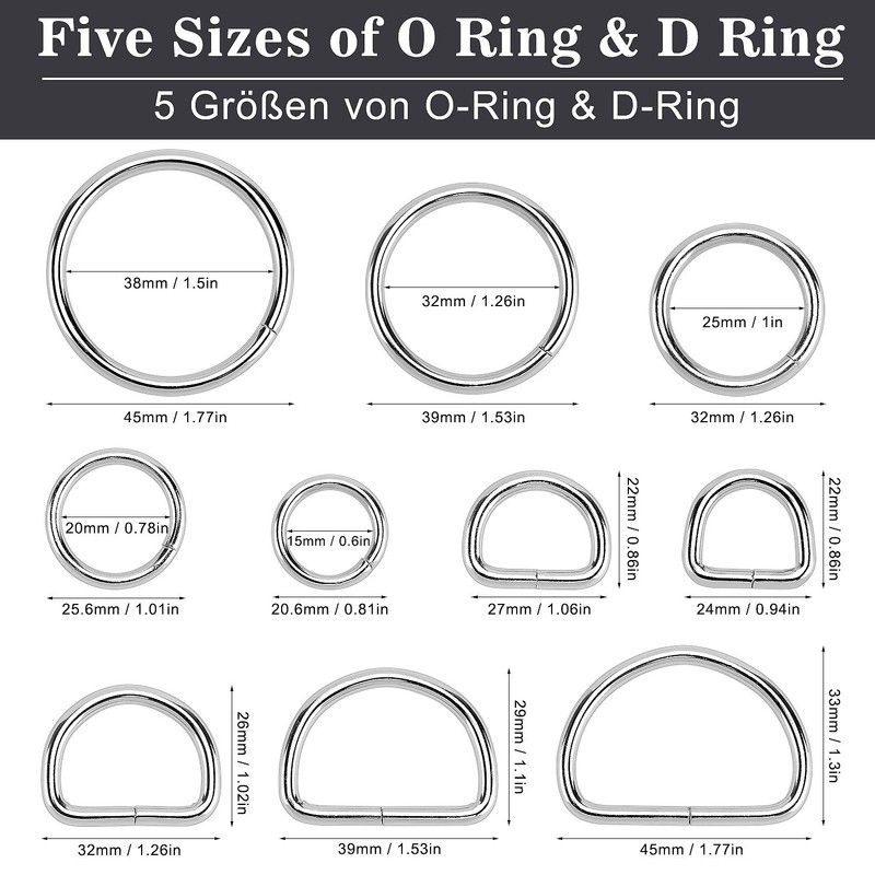 - Five sizes: each pack contains 5 sizes of metal O-rings and D-rings (15 mm, 20 mm, 25 mm, 32 mm, 38 mm) in inner diameter to meet your different needs. You will receive 25 pieces O-rings and 25 pieces D rings, which are available in five sizes, total 50 pieces.