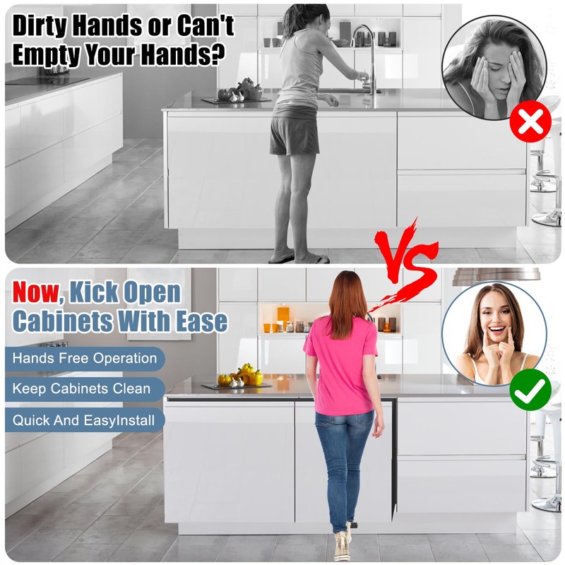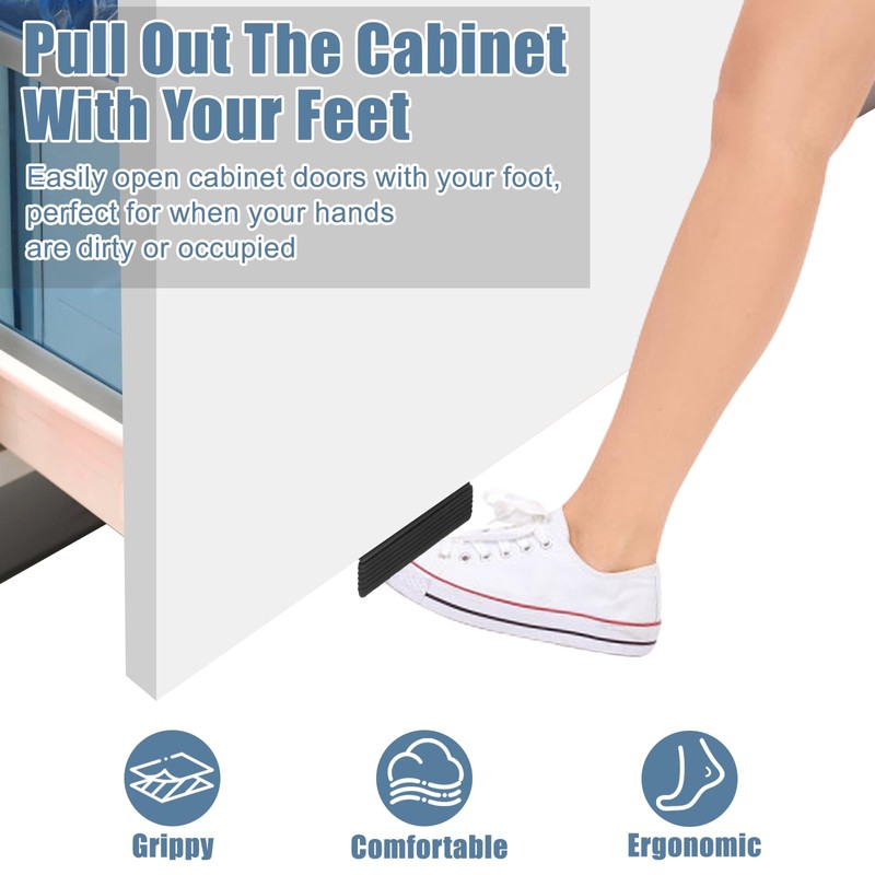 • PULL OUT THE CABINET WITH YOUR FEET: When you are in the kitchen and your hands are dirty or you can't easily open the cabinet door with something in your hand, our cabinet foot pull is a great solution that allows you to easily open the cabinet door with your foot; Cabinet doors are usually susceptible to damage from bacteria, water and food; With the cabinet foot pull, you will never have to worry about these issues again