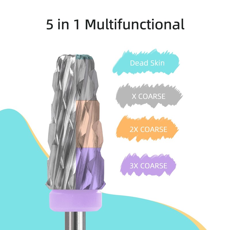 - hytoos 5-in-1 Nail Bit | Grit: 3X Coarse | Design: 5 in 1 tapered | Color: Orginal | 3/32"(2.35mm) Shank, two-way rotation, 7*15mm(0.27*0.59inch) | User: Experienced, Nail Tech, beginner