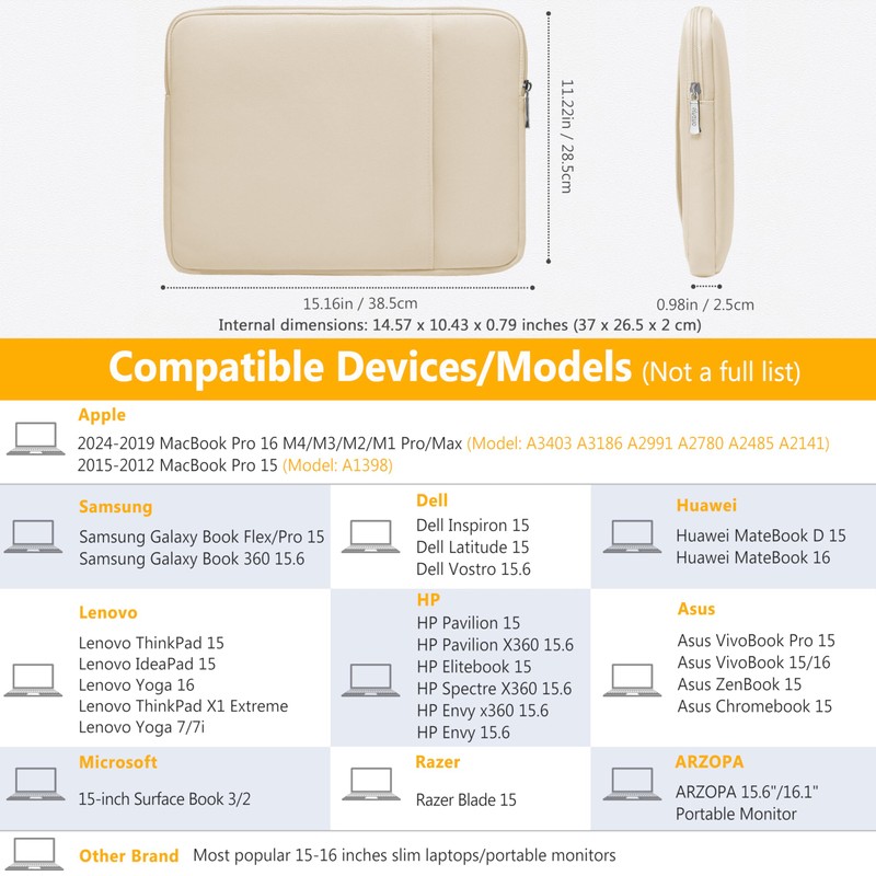 - Slim and Lightweight: External dimensions: 15.16 x 11.22 x 0.98 inches(38.5 x 28.5 x 2.5 cm), internal dimensions: 14.57 x 10.43 x 0.79 inches(37 x 26.5 x 2 cm). Can be easily carried in a briefcase/backpack/traveling case. Worry-free Warranty: You'll get a 12-month worry-free warranty. During this period, if there is any quality problem with the laptop bag, please feel free to contact us directly and our customer service team will respond to you quickly & provide a solution to your satisfaction