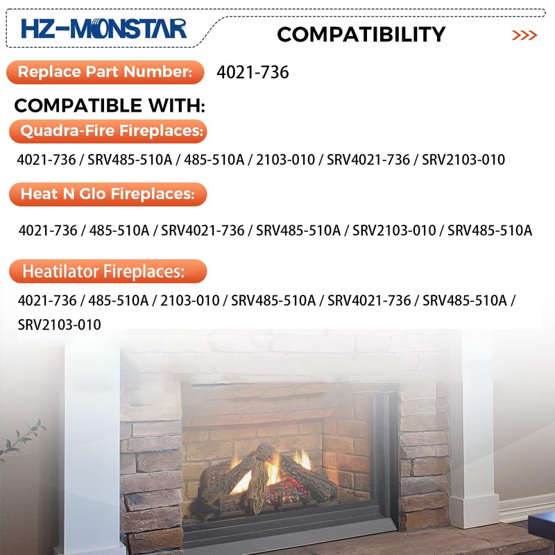 - Compatibility: The 4021-736 Pilot Assembly compatible with Heat-N-Glo: 4021-736 / 485-510A / SRV4021-736 / SRV485-510A / SRV2103-010 / SRV485-510A; Natural Gas Pilot Assembly compatible with Heatilator: 4021-736 / 485-510A / 2103-010 / SRV485-510A / SRV4021-736 / SRV485-510A / SRV2103-010; compatible with Quadrafire: 4021-736 / SRV485-510A / 485-510A / 2103-010 / SRV4021-736 / SRV2103-010.