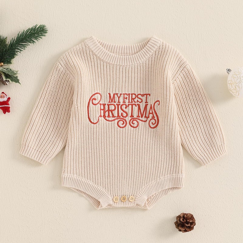 HZPHQY My First Christmas Baby Boy Girl Outfit Knit Romper Onesie Toddler Infant Long Sleeve Xmas Sweater Jumper Clothes (A Beige My First Christmas, 0-3 Months)