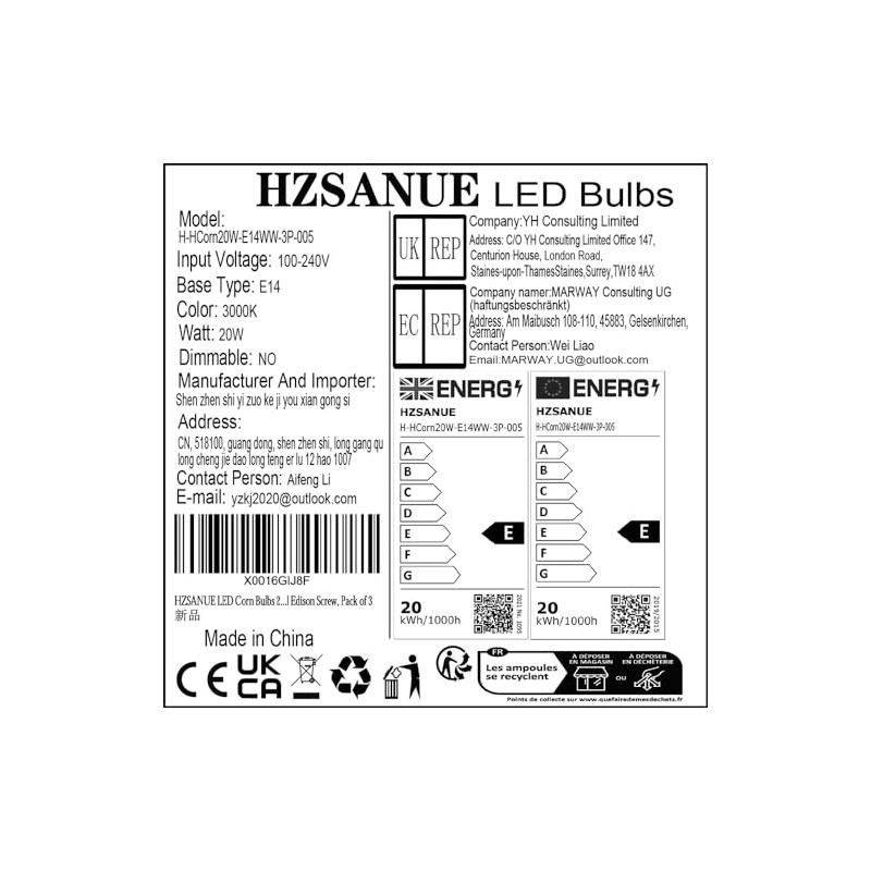 3 x HZSANUE 20W E14 LED Corn Bulbs