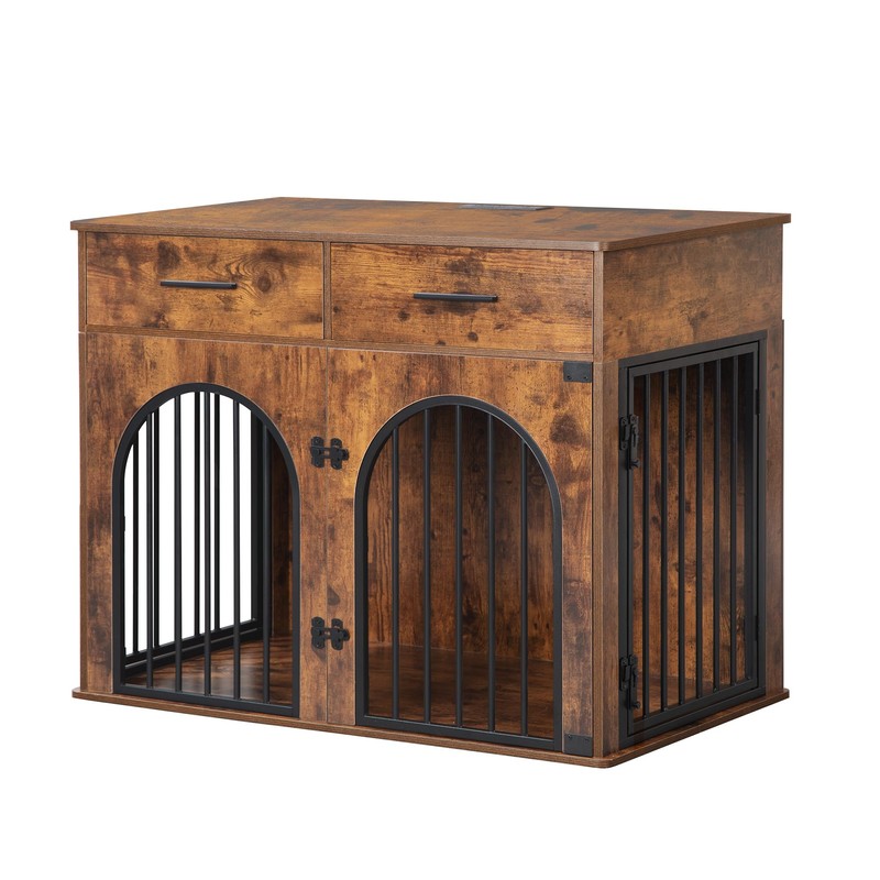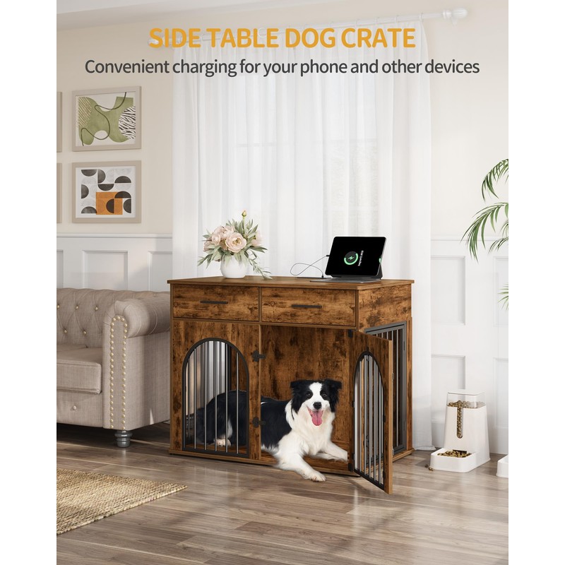 Hzuaneri 39.4'' Dog Crate Furniture with 2 Drawers, Indoor Dog Kennel with Charging Station, Wooden Dog Cage Side End Table Kennel for Medium/Large Dogs, Rustic Brown DFC84201B