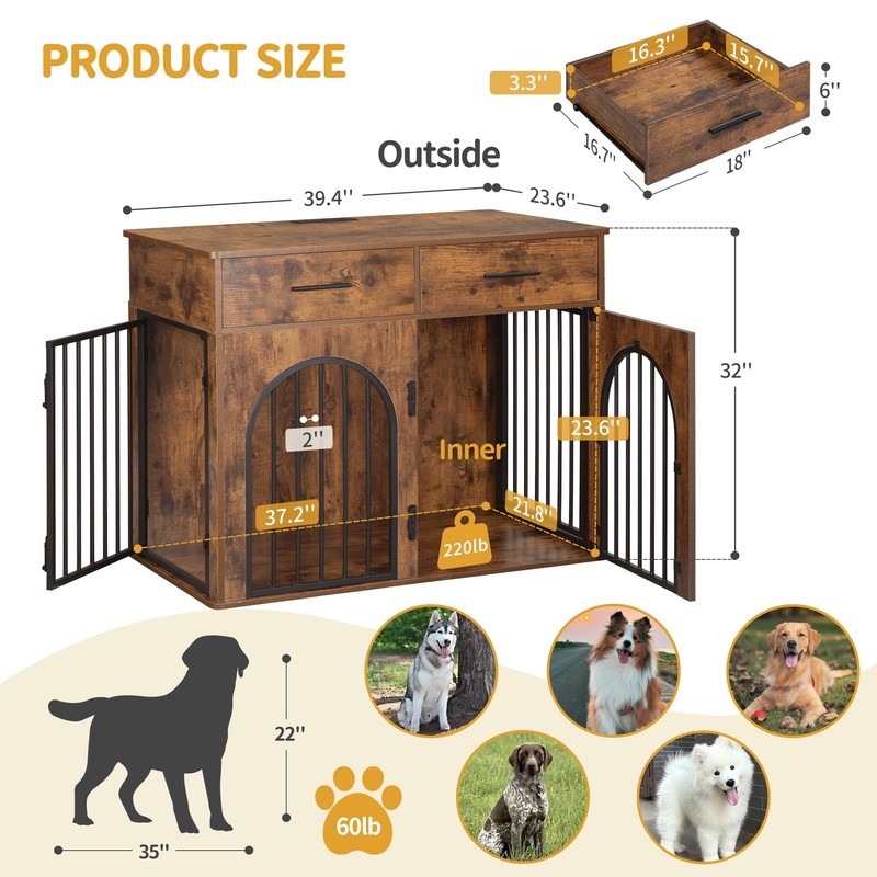 - Storage Drawers and Power Strip: This indoor furniture dog crate has 2 large roomy drawers where you can keep your dog's toys, balls and snacks. When it is used as an end table, you can also charge your cell phone, lamp or other devices with the power strip, very convenient for your daily life!