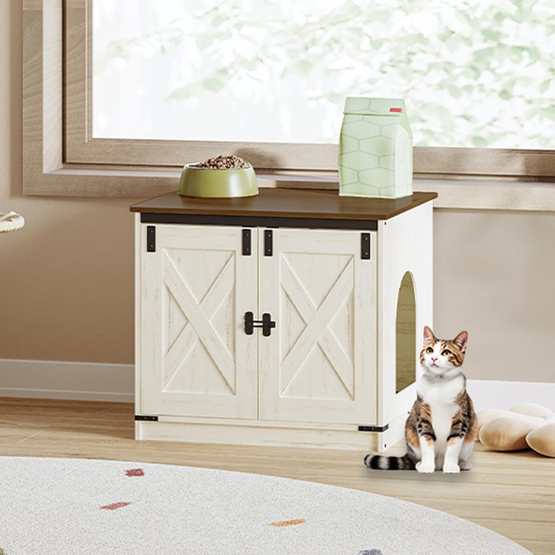 - Multi Purpose Pet Furniture:It is not only a cat litter box enclosure, but also can be used as a cat house or side table next to the sofa. The rustic style and unique barn door design easily fits into most home decor styles